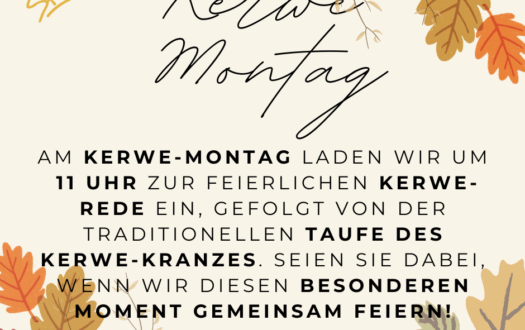 Am Kerwe-Montag laden wir um 11:00 Uhr zur feierlichen Kerwe-Rede ein, gefolgt von der traditionellen Taufe des Kerwe-Kranzes. Seien Sie dabei wenn wir diesen besonderen Moment gemeinsam feiern!